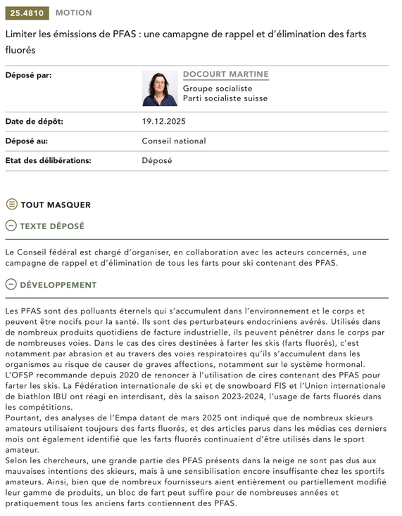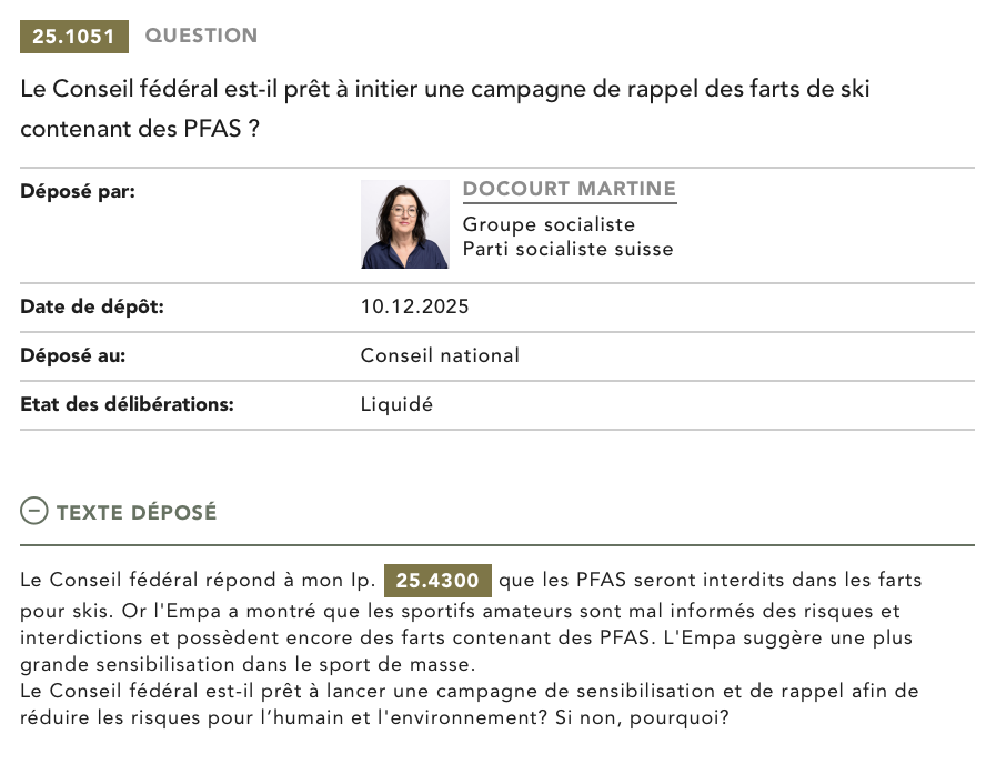 J'ai déposé une initiative parlementaire concernant les allocations de formation, ainsi que deux motions faisant suite à l'une de mes question sur les PFAS dans les farts fluorés, et une question relative à l'exemption de PFAS dans les emballages alimentaires.